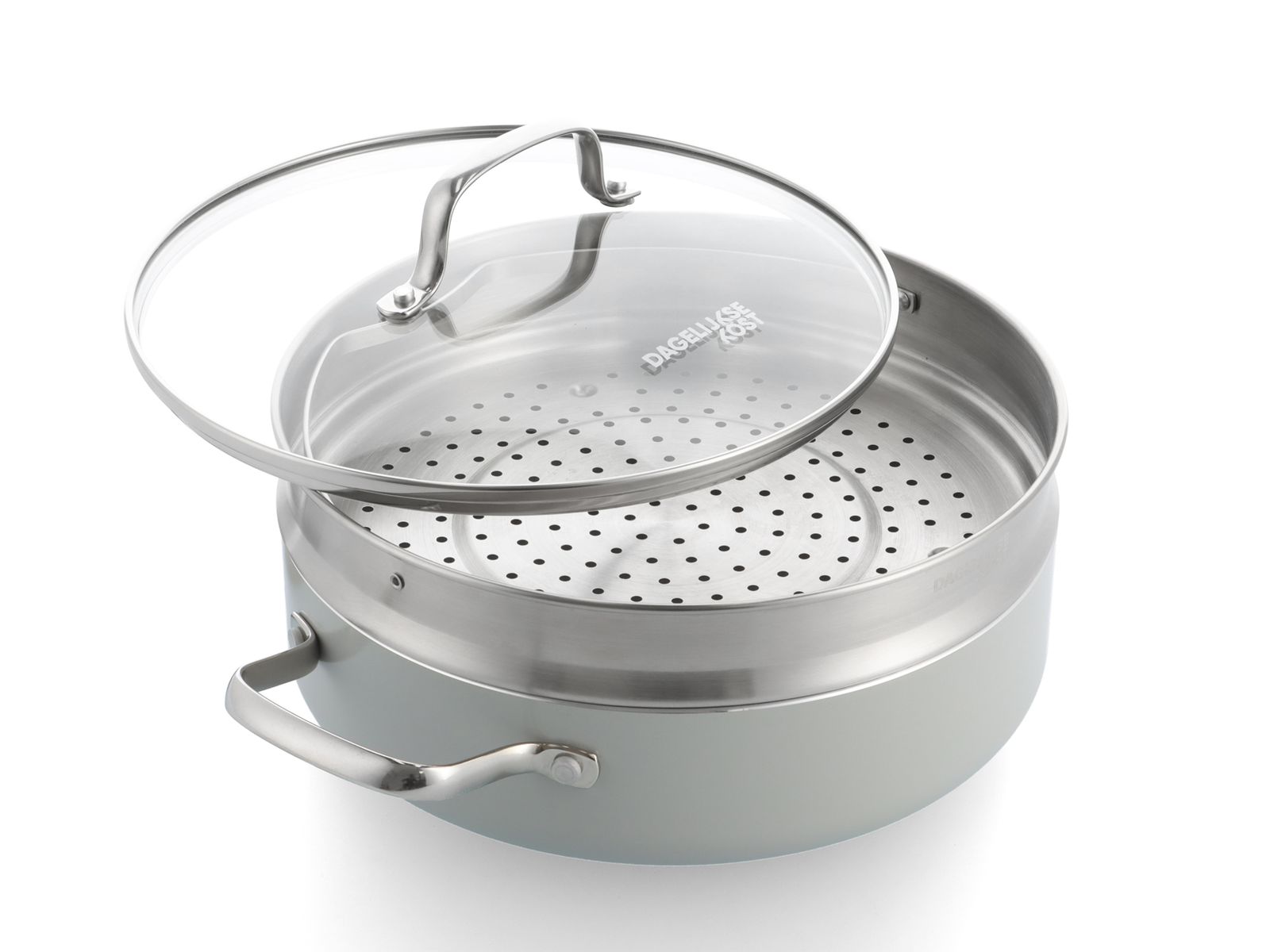 De aluminium pannen van Dagelijkse Kost hebben een keramische antiaanbaklaag, die de warmte snel en gelijkmatig geleidt. De pannen zijn zonder moeite schoon te maken en mogen ook in de vaatwas. Daarnaast hebben de pannen een ovenvaste greep in roestvrijstaal, kunnen op alle vuren inclusief inductie en zijn ovenvast tot 220°C. Echte allrounders dus, precies het soort pannen waarmee Jeroen Meus graag kookt. En het oog wil ook wat: deze collectie heeft een mooie lichtgrijze kleur en staat prachtig in elke keuken.